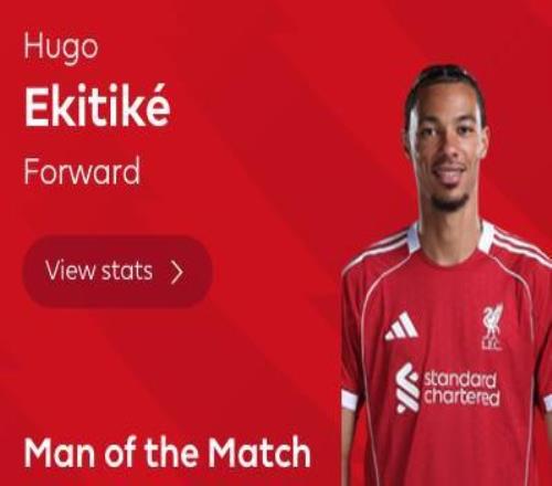 英超第15轮,利物浦客场3-3战平利兹联,此役上演梅开二度的埃基蒂克当选全场最佳球员。