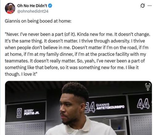 赛后谈及这一话题时,字母哥表示:“此前我从未经历过这种事,这对我来说很新鲜,当人们不相信我时,我会更加努力,我喜欢这种感觉。”