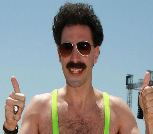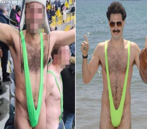 在与大约500名布鲁日球迷一同跋涉6000英里抵达阿拉木图后,这三人决定在普通衣服里面穿上波拉特标志性的绿色比基尼。这个角色是由英国演员萨莎・拜伦・科恩饰演的笨拙哈萨克斯坦记者,以尴尬互动著称,曾出演两部电影,最新一部于2020年上映。